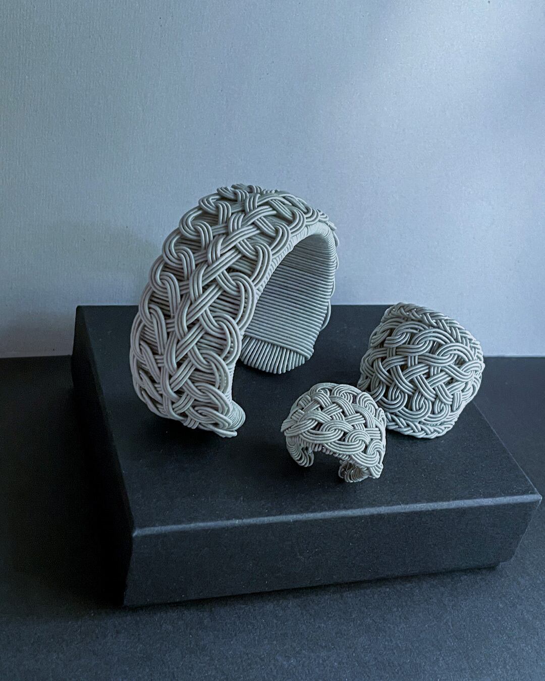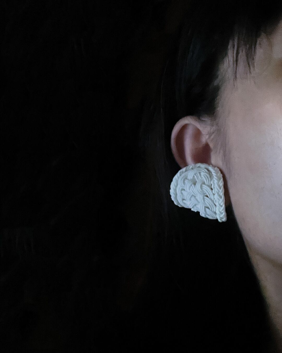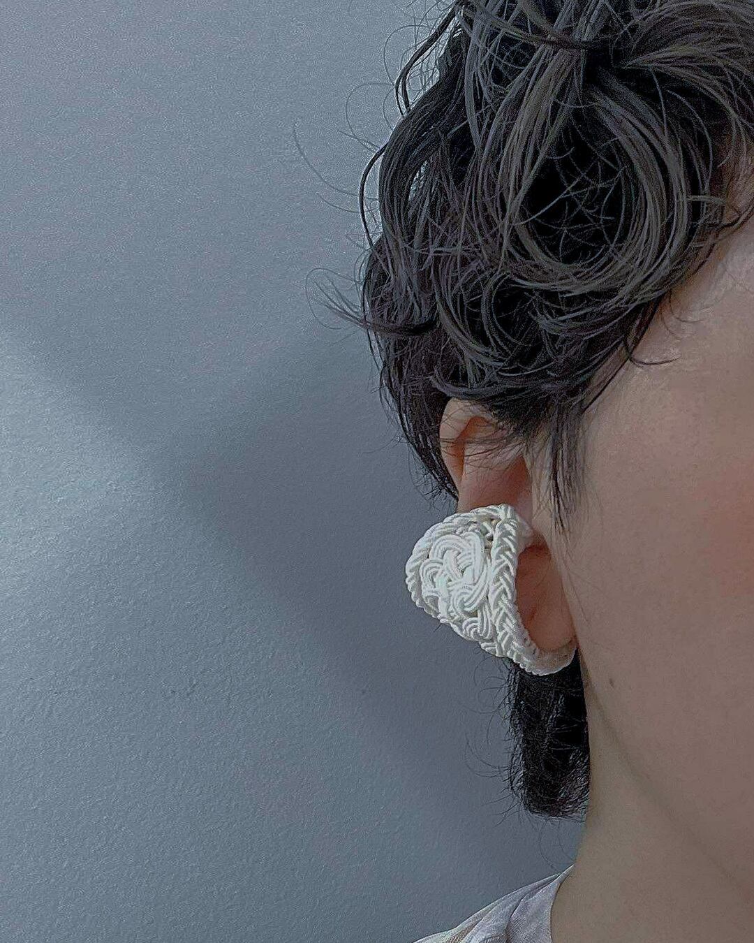 水引で作る植物作品の"葉"を表現する結び目が、表から裏へと大胆に耳たぶを覆います。